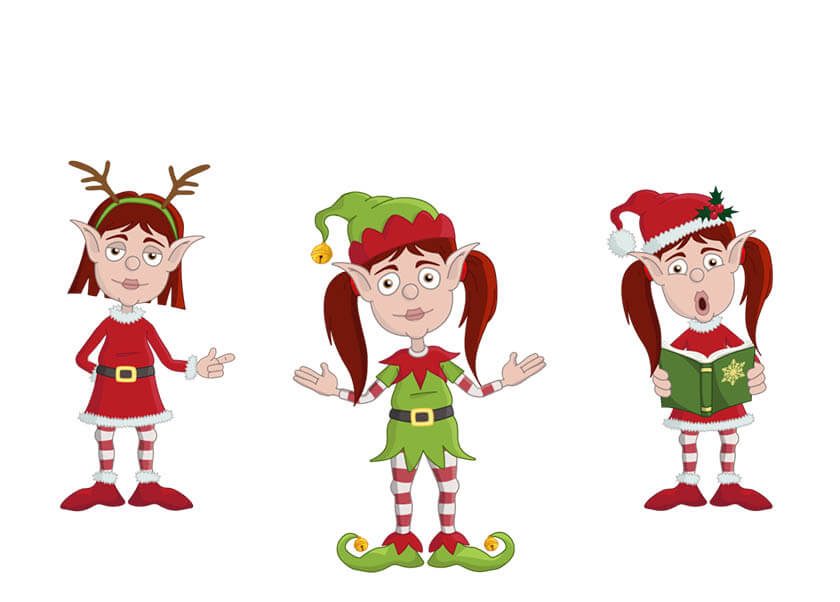 Red Xmas suit, Green Xmas suit, Green hat, Red hat, Antlers, Hair braids and short hair.